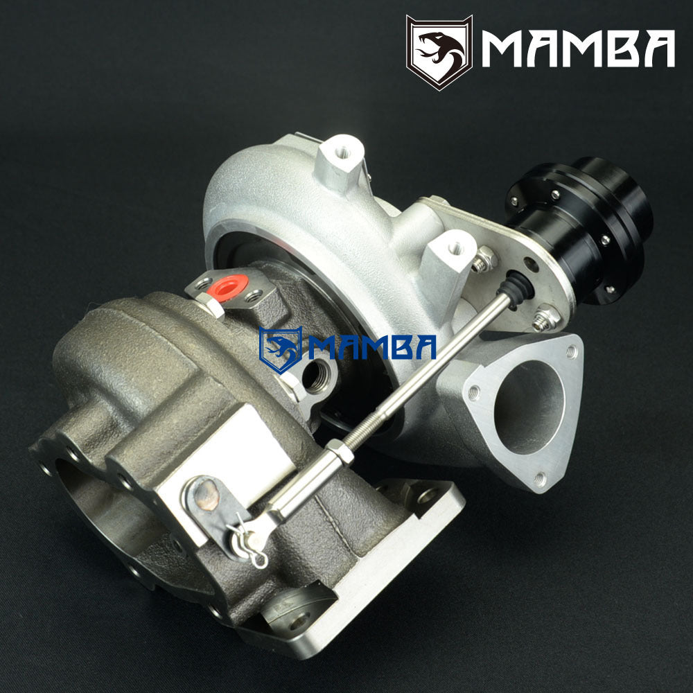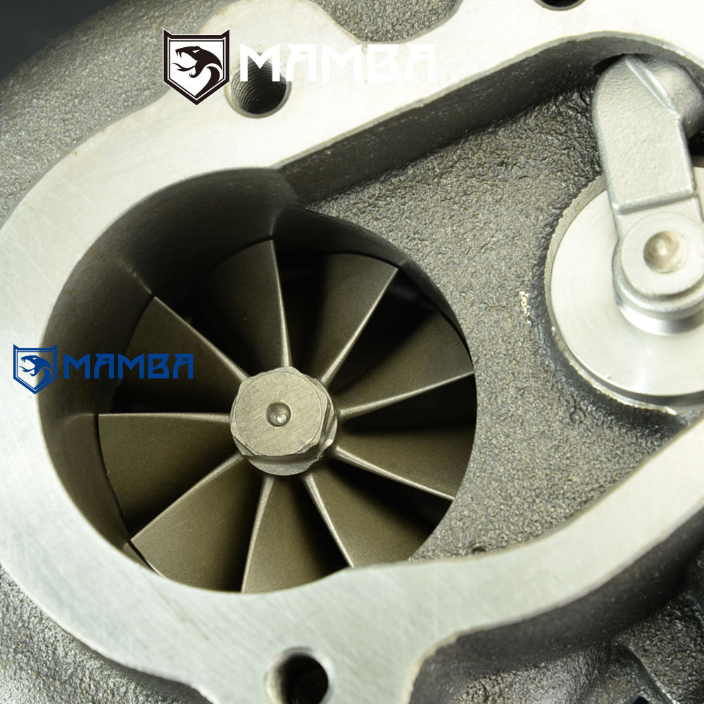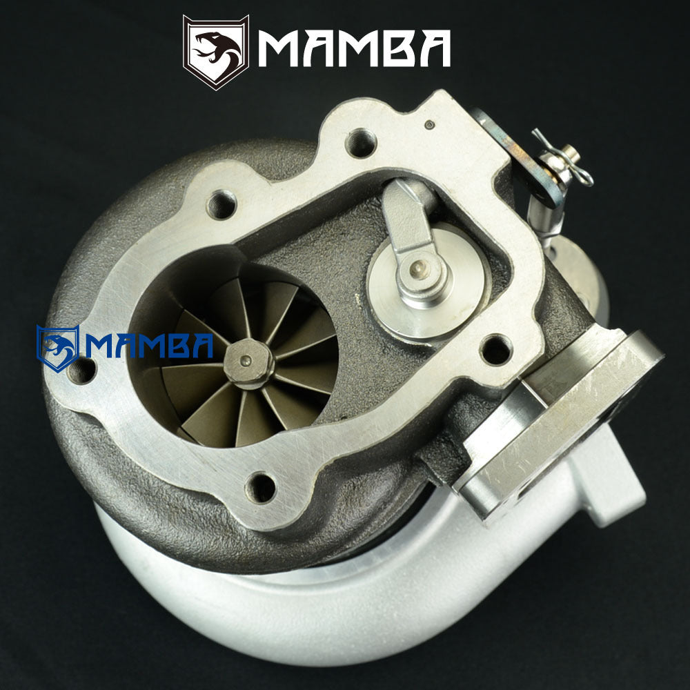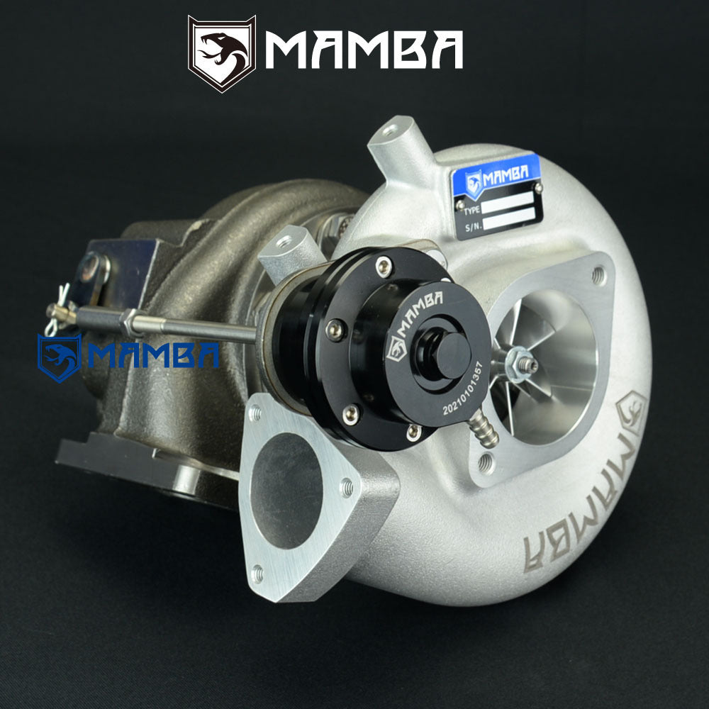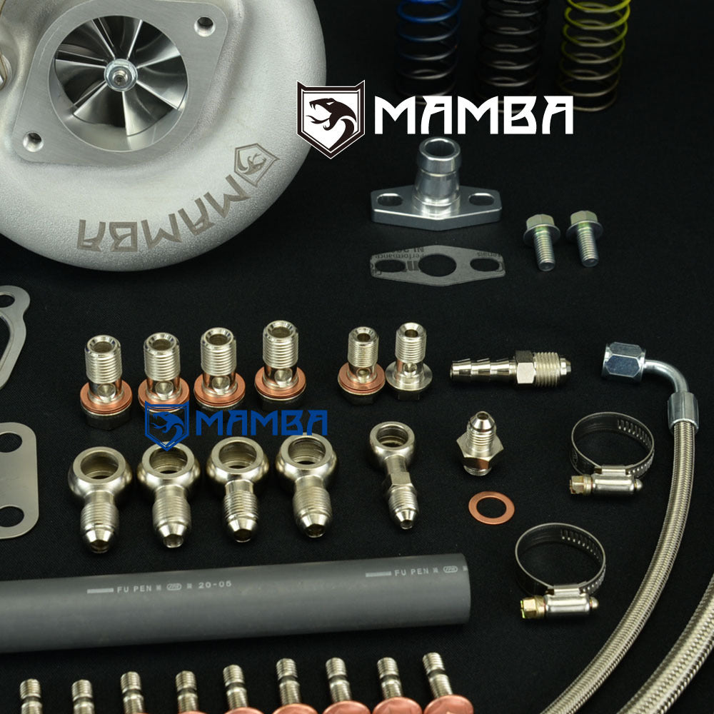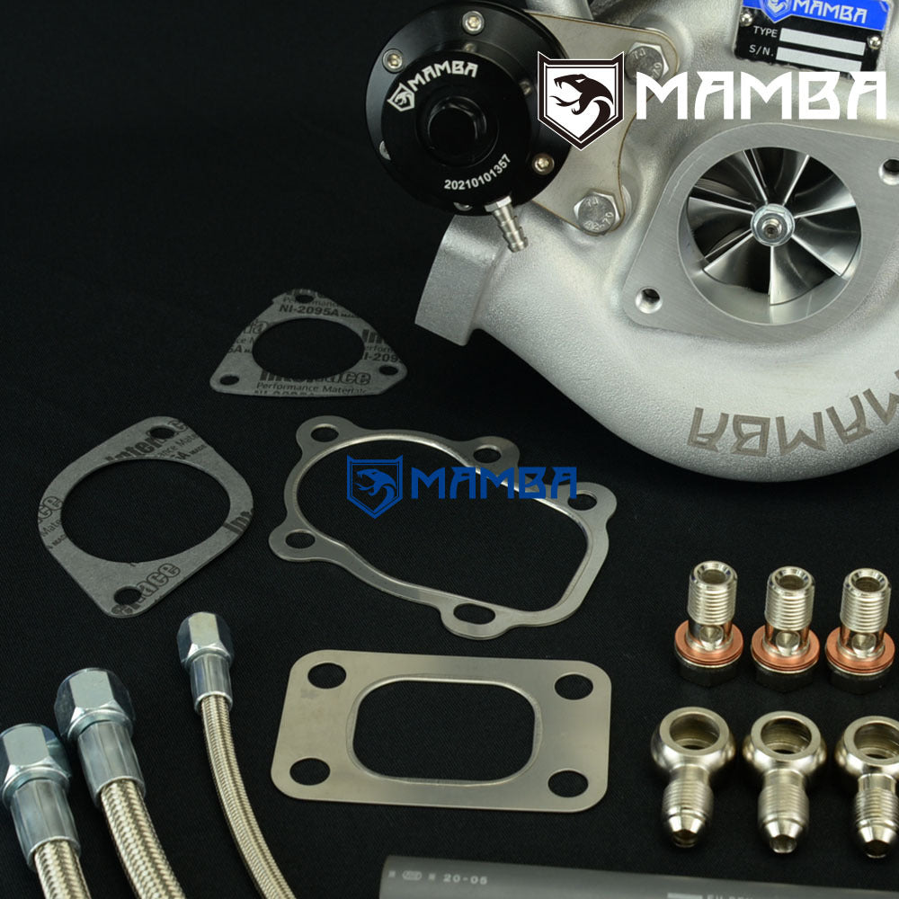Brand New in Box Balanced by Schenck Bolt-On Turbo. Application Nissan SR20DET S13 S14 S15 Support HP: 400~560HP Specs Compressor wheel: 54.1/71.0/58T (7+7 GTX Billet Blade) Turbine wheel : 51.8/56.5/84T (9 Blade High Flow) Turbine Housing A/R .64 Actuator 0.8bar spring is pre-installed on the adjustable actuator Additional 1.2bar and 1.5bar spring go with box Gen 3 piston type of adjustable actuator. Kit Includes 1 x MAMBA GTX2971R-58T turbocharger 1 x 4AN 1/4" (ID) oil feed line kit with 1.0mm restrictor 2 x 6AN 3/8" (ID) water line kit 1 x oil return hose kit 1 x turbine inlet gasket 1 x turbine outlet gasket 1 x cover inlet gasket 1 x cover outlet gasket 9 x M8x1.25 stud kit Everything shown on first picture is included
