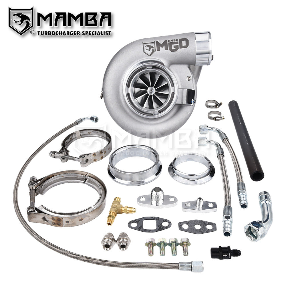 Kit Includes 1 x MAMBA MGD D5-10 4” G40-1150 ball bearing turbocharger 1 x PTFE Turbo oil feed line kit 2 x PTFE Turbo water line Kit 1 x NBR Turbo oil return line Kit 1 x 3.5” V-Band Flange with Clamp Set 1 x 4” V-Band Flange with Clamp Set Everything shown on first picture is included.
