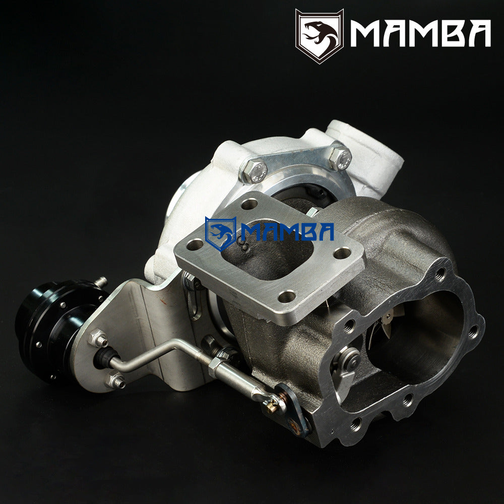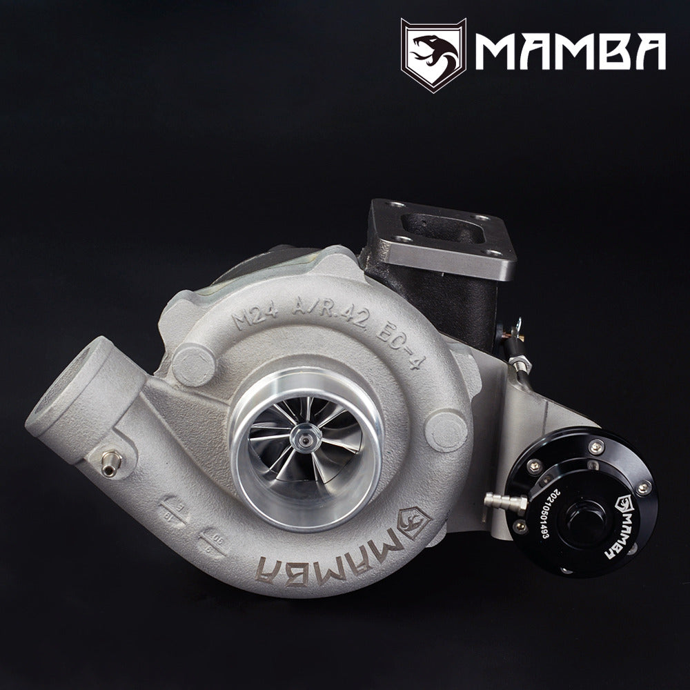 MAMBA Universal 7+7 2.4” A/R.42 GT2554R Ball Bearing Turbocharger + .42 T25 5-Bolt Cast IWG Turbine Housing Application Universal Use HP Support: 180~280 HP Engine: 1.5~3.0L (Gasoline), 3.0~6.0L (Diesel) Specs Compressor wheel : 42mm/54.3mm/60T (Performance 7+7 Blade Billet Wheel) Turbine wheel : 42mm/53mm/62T(9 Blade GT25R) Compressor Housing A/R:.42(Non Anti Surge) Compressor Inlet: 2.4” / 61.0mm Compressor Outlet: 2” / 50.8 mm Turbine Housing A/R : .42 IWG(Cast) Turbine Inlet: T25 Turbine Outlet: 5-Band Actuator 0.8bar spring is pre-installed on the adjustable actuator Additional 1.2bar and 1.5bar spring go with box. Kit Includes 1 x MAMBA 2.4” GT2554R Turbo. 1 x 70cm 1/4” PTFE Oil Feed line with 1.0mm restrictor. 2 x 25cm 3/8” PTFE Water line 1 x 3/4” Oil return flange 1 x SUS304 T25 Turbine Inlet Gasket 1 x SUS304 Turbine Outlet Gasket Everything shown on first picture is included.