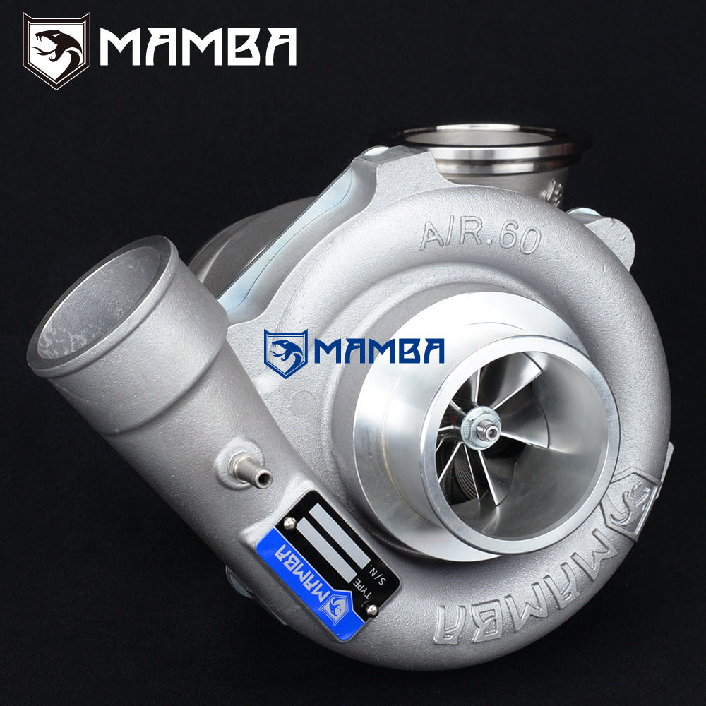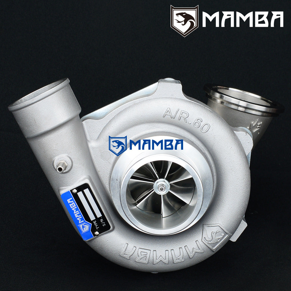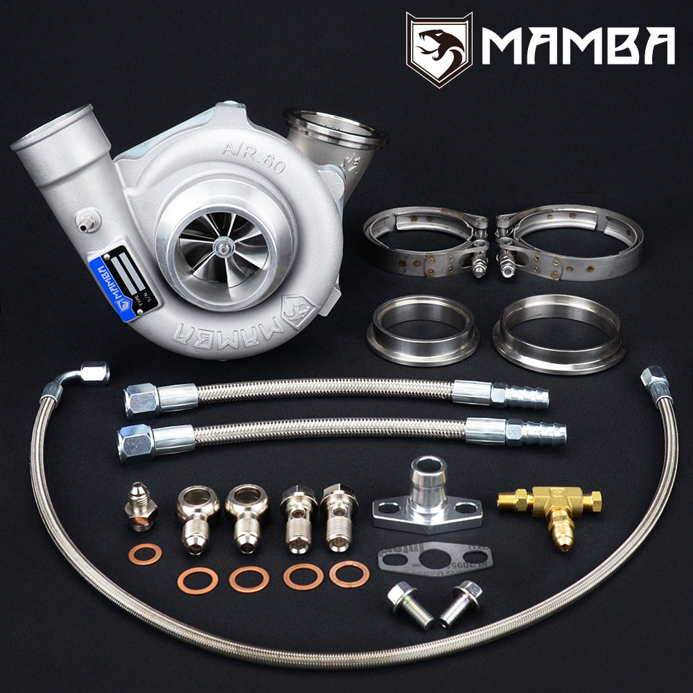 MAMBA Universal 7+7 2.25” A/R.60 GT2860RS Ball Bearing Turbocharger + .61 Dual V-Band Housing Application Universal Use HP Support: 250~380 HP Engine: 1.5~3.0L (Gasoline), 3.0~6.0L (Diesel) Specs Compressor wheel : 47.2mm/60.1mm/62T (Performance 7+7 Blade Billet Wheel) CompTurbine wheel : 47.0mm/53.8mm/76T (9 Blade GT(X)28R) Compressor Housing A/R:.60 (GT28R/PC200/Non Anti Surge) Compressor Inlet: 2.25” / 57.1mm Compressor Outlet: 2” / 50.8 mm Turbine Housing A/R : .61 Turbine Inlet: 2.35” V-Band Turbine Outlet: 3” V-Band Actuator 0.8bar spring is pre-installed on the adjustable actuator Additional 1.2bar and 1.5bar spring go with box. Kit Includes 1 x MAMBA 2.25” GT2860RS Turbo. 1 x 70cm 1/4” PTFE Oil Feed line with 1.0mm restrictor. 2 x 25cm 3/8” PTFE Water line 1 x 3/4” Oil return flange 1 x 2.35” V-Band Flange Kit 1 x 3” V-Band Flange Kit 1 x VSR balance sheet for the CHRA Everything shown on first picture is included