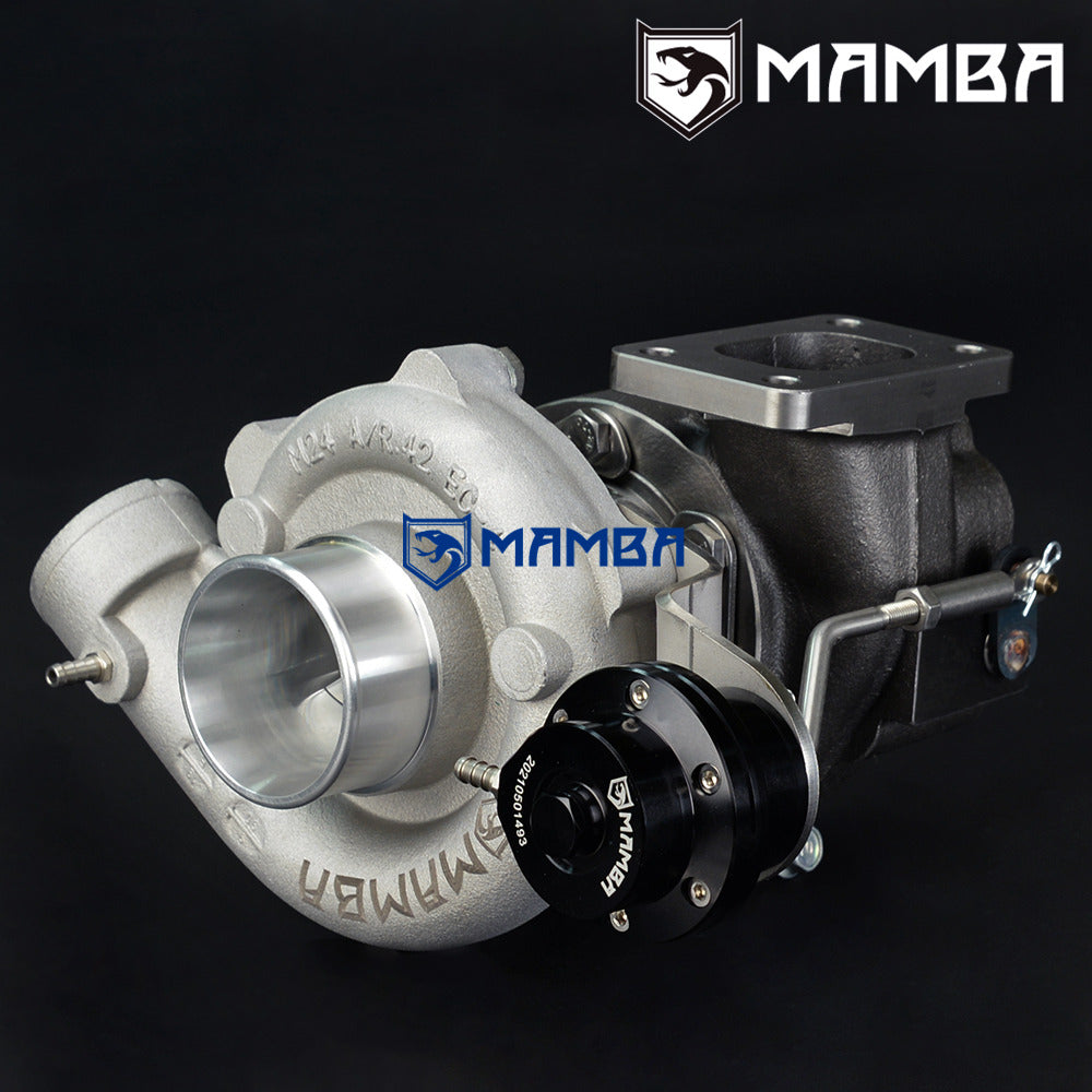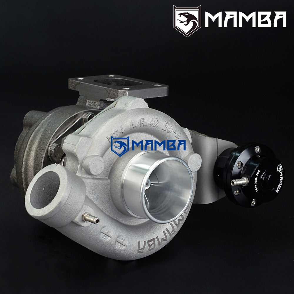 MAMBA Universal 7+7 2.4” A/R.42 GT2860RS Ball Bearing Turbocharger + .42 T25 5-Bolt Cast IWG Turbine Housing Application Universal Use HP Support: 250~380 HP Engine: 1.5~3.0L (Gasoline), 3.0~6.0L (Diesel) Specs Compressor wheel : 47.2mm/60.1mm/62T (Performance 7+7 Blade Billet Wheel) Turbine wheel : 47 mm/53.8 mm/76T (9 Blade GT28R) Compressor Housing A/R:.42(Non Anti Surge) Compressor Inlet: 2.4” / 61.0mm Compressor Outlet: 2” / 50.8 mm Turbine Housing A/R : .42 IWG (Cast) Turbine Inlet: T25 Turbine Outlet: 5 Band Actuator 0.8bar spring is pre-installed on the adjustable actuator Additional 1.2bar and 1.5bar spring go with box. Kit Includes 1 x MAMBA 2.4” GT2560R Turbo. 1 x 70cm 1/4” PTFE Oil Feed line with 1.0mm restrictor. 2 x 25cm 3/8” PTFE Water line 1 x 3/4” Oil return flange 1 x SUS304 T25 Turbine Inlet Gasket 1 x SUS304 Turbine Outlet Gasket Everything shown on first picture is included.