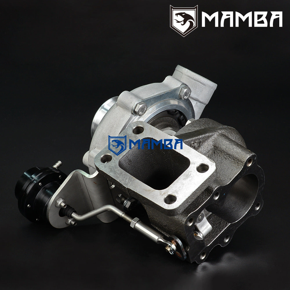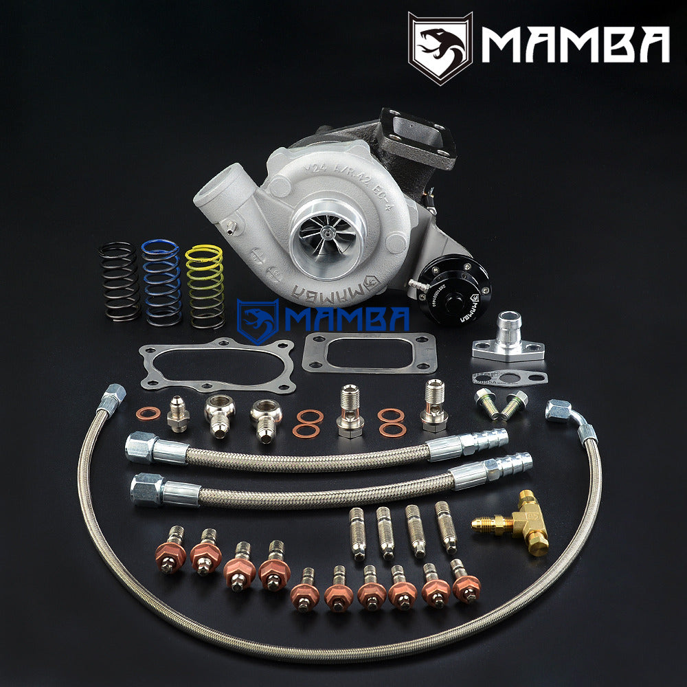 Application Universal Use HP Support: 250~380 HP Engine: 1.5~3.0L (Gasoline), 3.0~6.0L (Diesel) Specs Compressor wheel : 47.2/60.1/62T (Performance 7+7 Blade Billet Wheel) Turbine wheel : 47/53.8/76T (9 Blade GT28R) Compressor Housing A/R:.42(Non Anti Surge) Compressor Inlet: 2.4” / 61.0mm Compressor Outlet: 2” / 50.8 mm Turbine Housing A/R : .57 IWG Turbine Inlet: T3 Turbine Outlet: 6 Bolt (RB25) Actuator 0.8bar spring is pre-installed on the adjustable actuator Additional 1.2bar and 1.5bar spring go with box. Kit Includes 1 x MAMBA 2.4” GT2860RS Turbo. 1 x 70cm 1/4” PTFE Oil Feed line with 1.0mm restrictor. 2 x 25cm 3/8” PTFE Water line 1 x 3/4” Oil return flange 1 x SUS304 T3 Turbine Inlet Gasket 1 x SUS304 Turbine Outlet Gasket Everything shown on first picture is included.